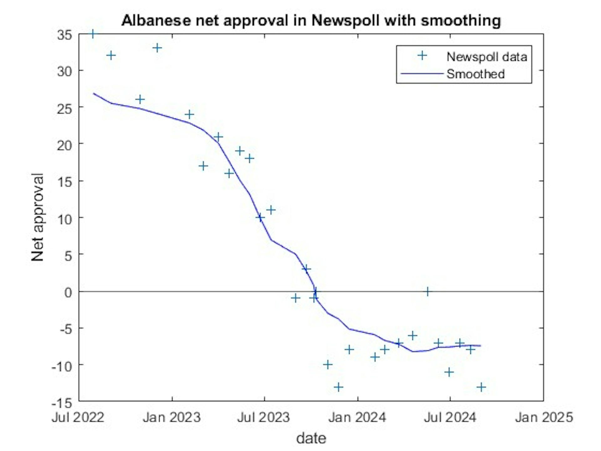The graph below shows Albanese’s net approval in Newspoll this term. The plus signs are Newspoll results and a smoothed line has been fitted.